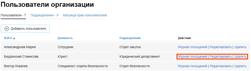 1. Чтобы отследить действия пользователя в Системе, перейдите по ссылке Журнал посещений.
