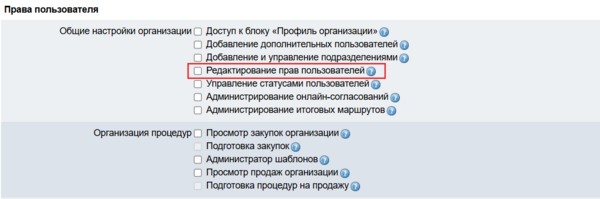 2. Чтобы управлять правами пользователей организации требуется полномочие Редактирование прав пользователей. Данное полномочие по умолчанию получает главный пользователь организации при регистрации и может подключить его другому сотруднику организации.