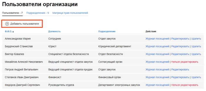 2.1. Чтобы редактировать личные данные пользователей организации дополнительно требуется полномочие Добавление дополнительных пользователей.