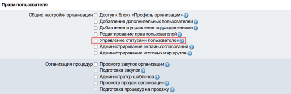 4. Чтобы иметь доступ к статусам всех пользователей организации, а также управлять ими (активировать, деактивировать, удалять пользователей, а также совершать действия над приглашенными пользователями после того, как они подтвердят приглашение), требуется полномочие Управление статусами пользователей. Данное полномочие по умолчанию получает главный пользователь организации при регистрации и может подключить его другому сотруднику организации.