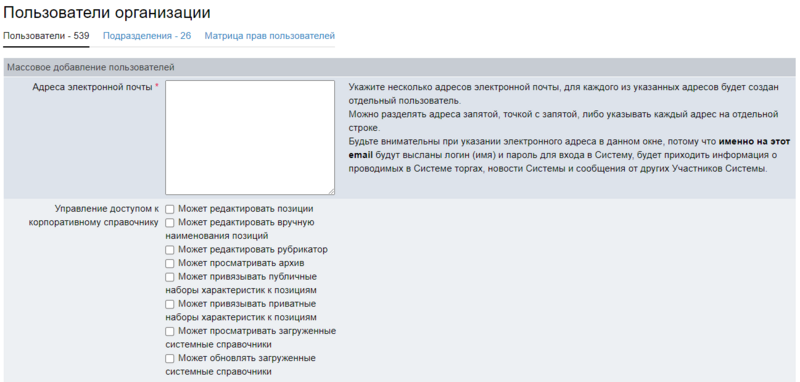 2. Заполните форму, внеся в поле Адреса электронной почты адреса пользователей, которых необходимо добавить в Систему. Также установите отметки в полях напротив наименований полномочий, которыми необходимо наделить новых пользователей, после чего нажмите кнопку Сохранить.