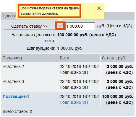 Если цена лота снижается до минимального значения, в таблице ставок появляется значок со всплывающей подсказкой Возможна подача ставки на право заключения договора. После подачи такой ставки торги продолжатся, но аукцион будет проводиться на право заключения договора, где участники делают ставки на повышение.