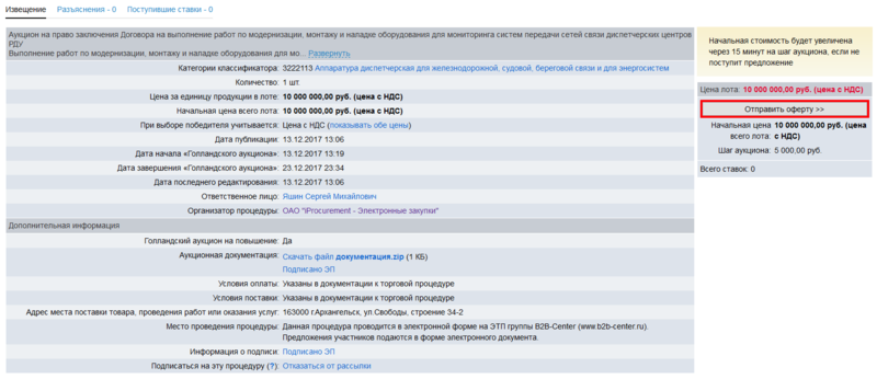 Участники Системы, подписавшиеся на рассылку уведомлений о голландском аукционе, также получают после завершения торгов уведомление о завершении процедуры и определении победителя.