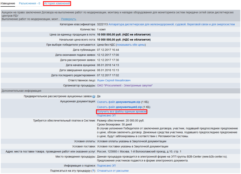 Если организатор вносит изменения в извещение или состав аукционной документации после объявления процедуры, эти изменения фиксируются на странице История изменений.
