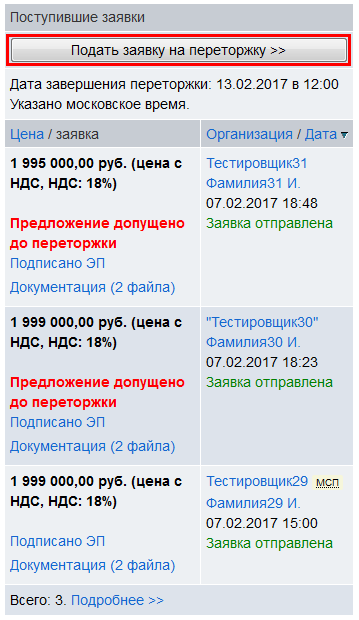 После окончания переторжки цены, поданные во время ее проведения, открываются для просмотра.