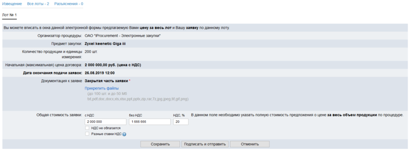 2.2. Внесите изменения в ценовое предложение и состав прилагаемых к заявке файлов. Нажмите кнопку Подписать и отправить. Отобразится страница подписания электронного документа.