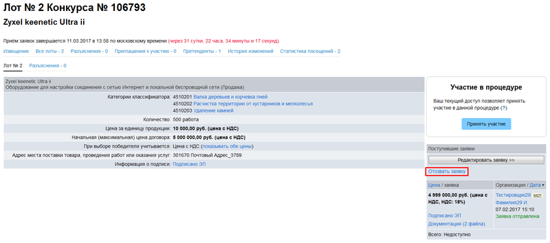 • если организатор предусмотрел возможность отзыва участниками поданных заявок по всем лотам конкурса, вы можете отозвать заявку в любой момент.