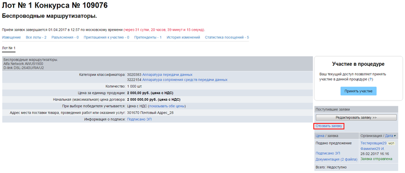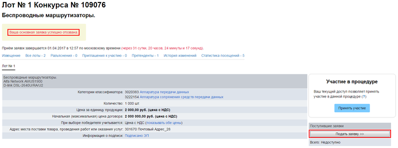 • если организатор предусмотрел возможность отзыва участниками поданных заявок по всем лотам конкурса, вы можете отозвать заявку в любой момент.