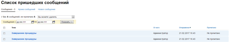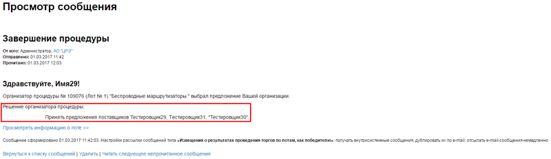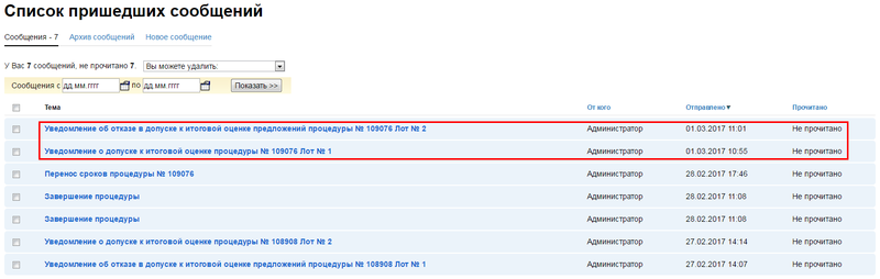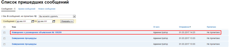 1. По результатам рассмотрения заявок участникам рассылаются уведомления о допуске/отклонении в раздел Список пришедших сообщений Личного кабинета.