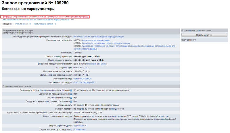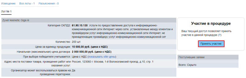 3. Если вы не участвовали в конкурсе или не входите в список победителей по лоту, при попытке подать заявку отобразится уведомление Процедура с ограниченным кругом участников. Проводится по итогам неценовых процедур.