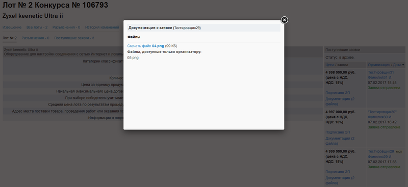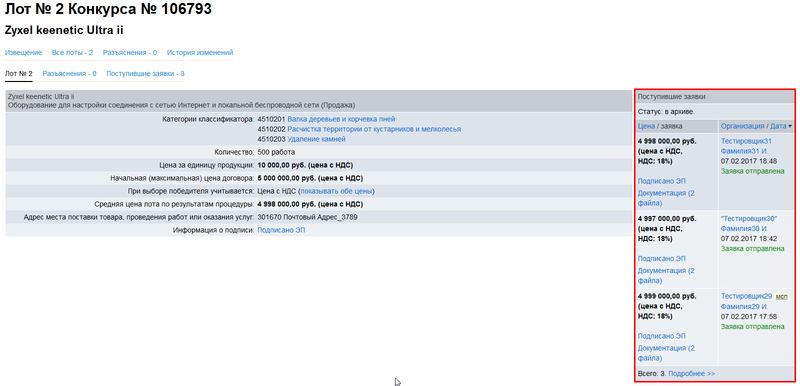 1. Откройте страницу лота. В таблице Поступившие заявки отображаются все заявки, поданные на этот лот, в виде ценовых предложений и ссылок для просмотра и скачивания файлов.
