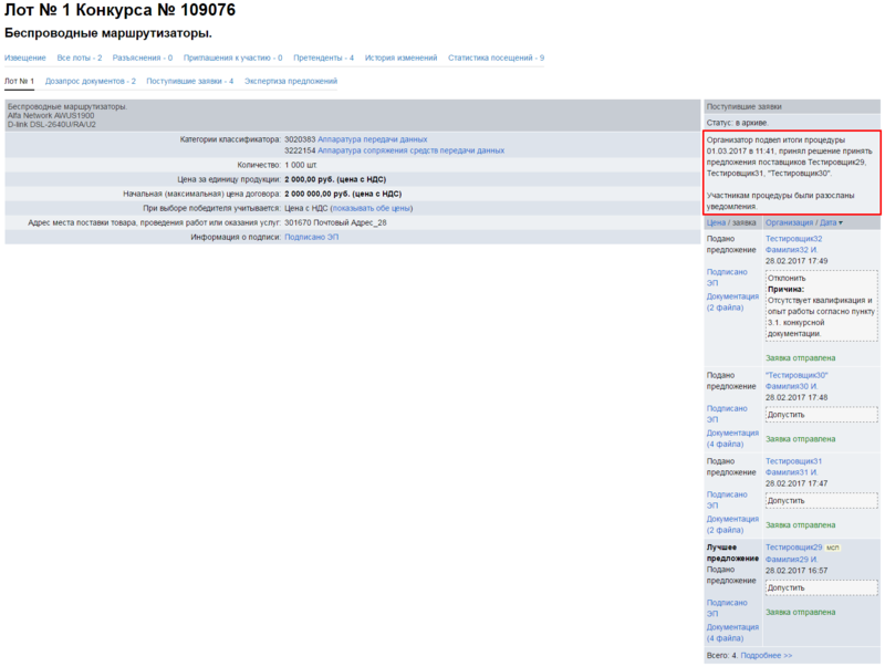 3. После рассмотрения заявок организатор подводит итоги конкурса и выносит решение по лотам. Если в лоте допущено 2 или больше заявок, организатор ранжирует их и присваивает места. В конкурсах на право заключения рамочного соглашения победителям по лоту считаются все участники, заявки которых были допущены.