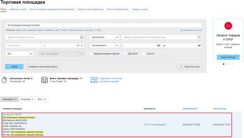2. Введите в строку поиска ключевые слова, взятые из извещения или лотов конкурса, заполните другие поля данными о процедуре и компании-организаторе, после чего нажмите кнопку Найти. Отобразятся результаты поиска торговой процедуры.