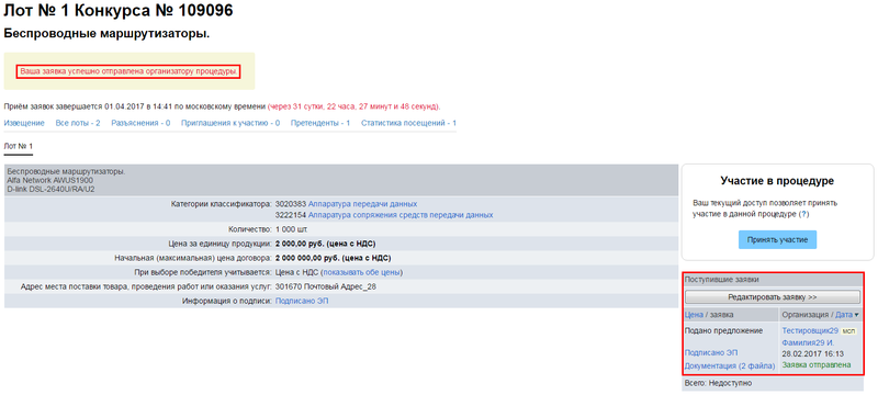 Отобразится страница лота с уведомлением Ваша заявка успешно отправлена организатору процедуры. В таблице Поступившие заявки отобразится ценовое предложение и ссылка для просмотра и скачивания приложенных к заявке файлов.