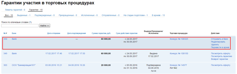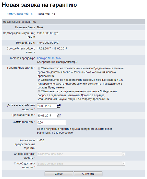 В течение срока действия лимита вы можете подавать заявки на получение гарантий в отдельных торговых процедурах.