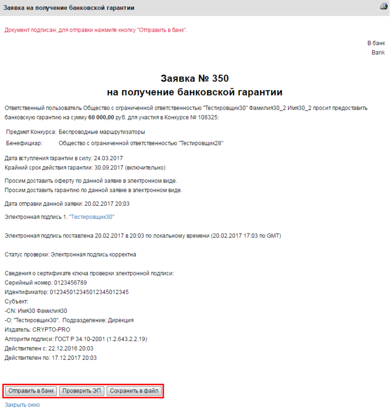 . Страница подписания заявки обновится и появится уведомление Документ подписан, для отправки нажмите кнопку «Отправить в банк».