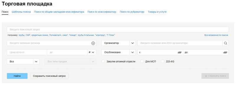 1. Чтобы найти нужный конкурс, перейдите в раздел Поиск. Отобразится форма поиска торговых процедур.