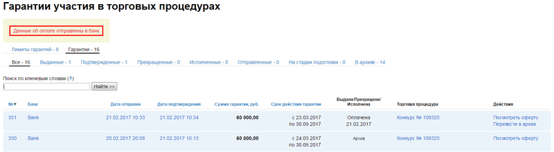 Отобразится страница Гарантии с уведомлением Данные об оплате отправлены в банк.