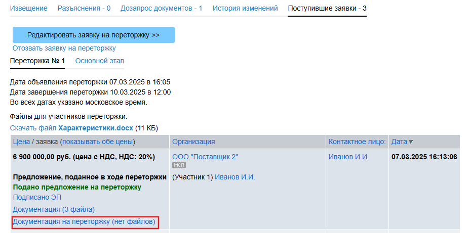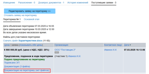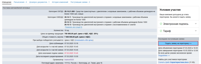 - Дата завершения переторжки: в указанный срок прием заявок завершается, но доступна загрузка документации;
