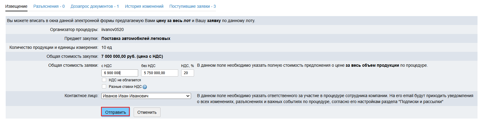 . Новая версия предложения сохранится в таблице Последние поступившие заявки на странице извещения и на странице .