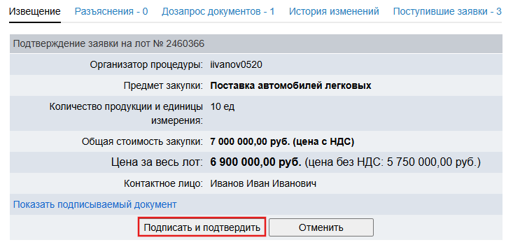 3. Отобразится форма для подписания вашего предложения электронной подписью. Для просмотра подписываемого документа нажмите ссылку Показать подписываемый документ. Далее нажмите кнопку