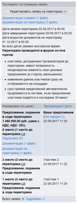 При этом предложения других участников, как и названия их организаций, будут скрыты. В таблице Последние поступившие заявки будет отображаться только ваше предложение, поданное на переторжку, и ранги всех участников процедуры (место до переторжки и место новой заявки).