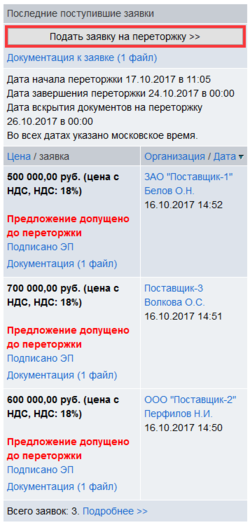 В ходе переторжки в блоке Последние поступившие заявки отображаются предложения, допущенные организатором к переторжке. После подачи другим участником предложения на переторжку в его ячейке появляется текстовая отметка Подано предложение на переторжку.