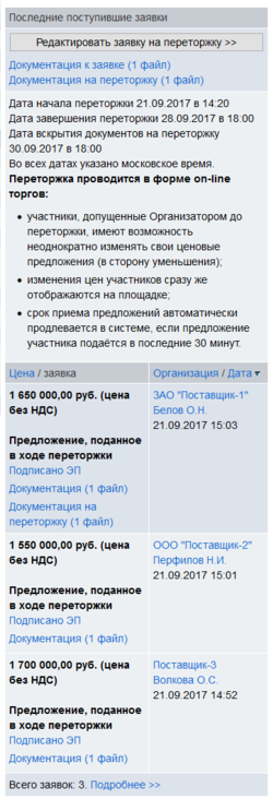 Процедура переторжки может быть проведена организатором в виде онлайн-торгов аукционного типа. В ходе онлайн-переторжки в блоке Последние поступившие заявки отображаются ценовые предложения других участников, которые также могут наблюдать за изменением вашей цены и редактировать свои предложения.