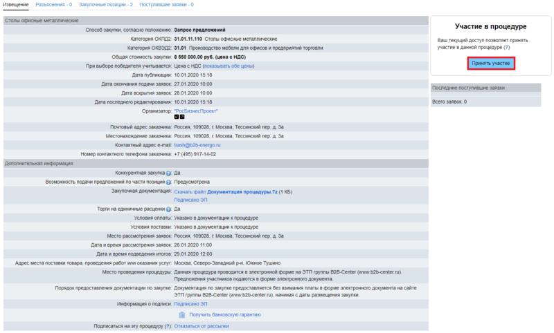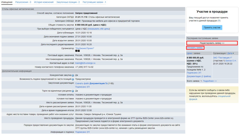 Информация на странице обновляется с каждым поступившим предложением. До наступления указанной в извещении даты окончания подачи заявок вы можете редактировать свою заявку и пакет документации.