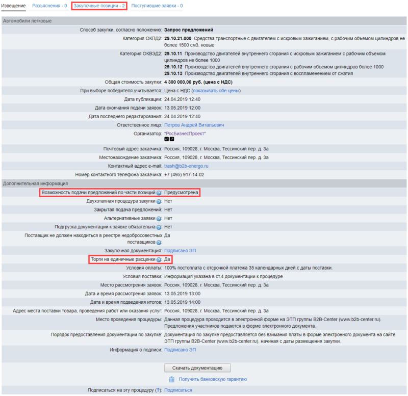 Для детального ознакомления с заинтересовавшей вас торговой процедурой нажмите ссылку с наименованием товара/услуги в Поиске. Таким образом вы перейдете на страницу . Если процедура предусматривает Возможность подачи предложений по части позиций и Торги на единичные расценки, соответствующие отметки будут зафиксированы в блоке Дополнительная информация.