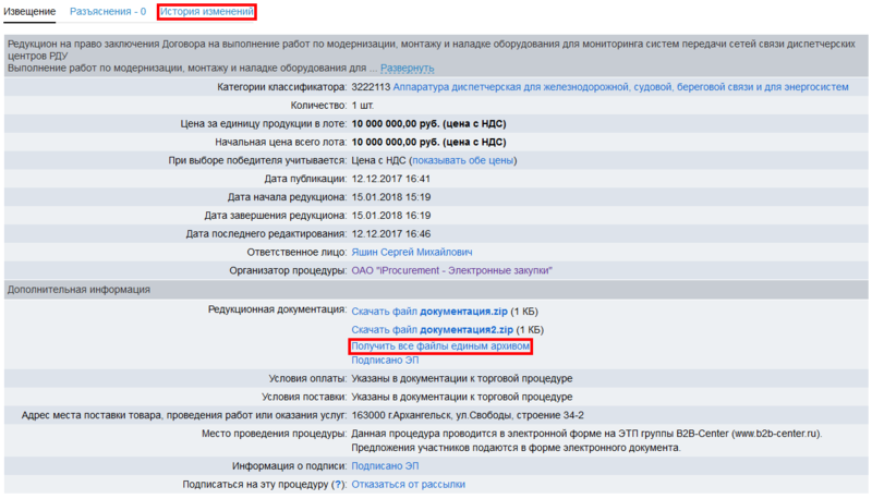 Если организатор вносит изменения в извещение или состав редукционной документации после объявления процедуры, эти изменения фиксируются на странице История изменений.