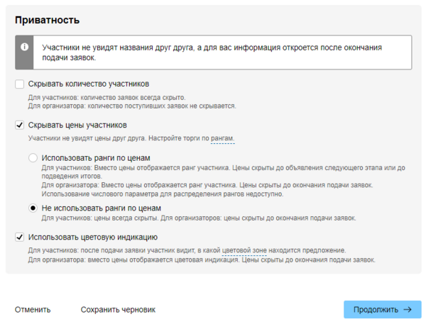1. При создании процедуры установите отметку Скрывать цены участников в блоке Приватность.