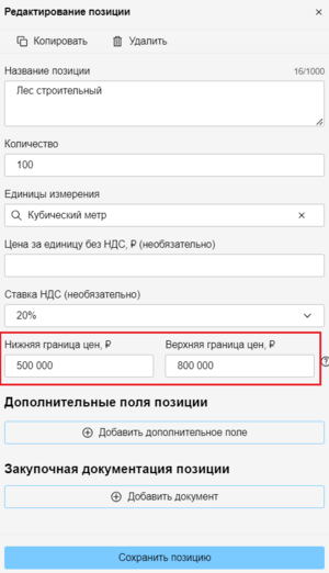 3. В форме добавления позиции заполните поля Нижняя граница цен и Верхняя граница цен.