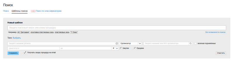 Шаблоны поиска - удобный способ отслеживания новых закупок для вашей компании. Вы можете сохранить поисковый запрос в виде шаблона, чтобы не настраивать фильтры при каждом поиске.