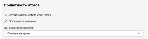 - Отметки Приватности итогов - выберите Опубликовать список участников, если хотите показать количество участников процедуры. Вы можете дополнительно опубликовать названия участников, выбрав Показать названия, а также показать цены (ранги) участников, выбрав соответствующий вариант из выпадающего списка Ценовые предложения.
