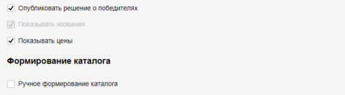 Выберите Опубликовать решение о победителях, если необходимо опубликовать выбор и название победителей в процедуре. Вы можете дополнительно опубликовать цены победителей; - Отметка Формирование каталога - активируйте данную отметку, если необходимо сформировать каталог вручную после проведения процедуры.
