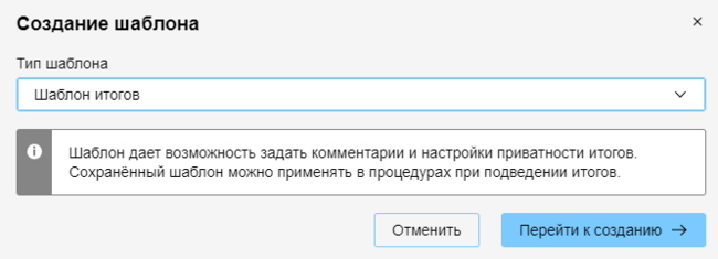 2. Чтобы создать шаблон, нажмите одноименную кнопку и выберите из выпадающего списка тип шаблона Шаблон итогов.