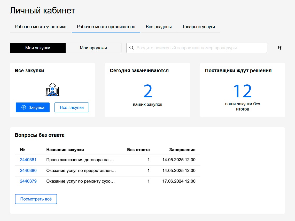 - Виджет «Все закупки» / «Все продажи» — быстрый переход к созданию новой процедуры и удобный доступ к списку всех ваших закупок и продаж.