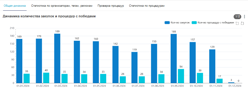 - «Статистика по процедурам» — показывает информацию по закупкам и позициям, в которых победителем стала другая компания (учитываются настройки скрытия, выставленные организатором).