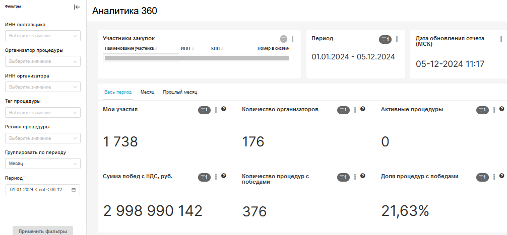 С 1 января 2025 года для поставщиков станет доступен новый интерактивный дашборд «Аналитика 360». Он позволит провести оперативный анализ работы на площадке, изучить полный объем подходящих торгов и сравнить себя с конкурентами.