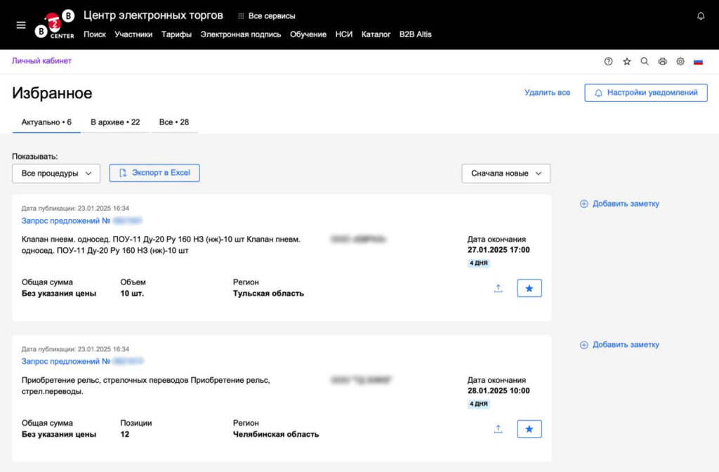Мы обновили раздел «Избранное» на B2B-Center: добавили мобильную версию и сделали работу с большим списком процедур удобнее. Новые функции помогут эффективнее управлять сохраненными торгами и сэкономят время работы на площадке.