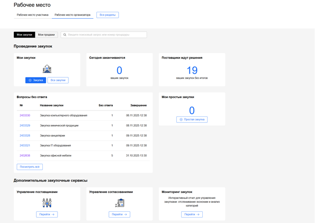 B2B-Center (входит в крупнейшую российскую цифровую платформу закупок и продаж B2B-РТС) обновил Рабочее место организатора закупок. Три дополнительных виджета стали доступны пользователям сразу на главном экране — «Мониторинг закупок», «Управление согласованиями» и «Управление поставщиками».